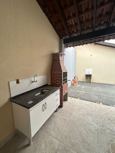 Edícula com piso cerâmico, churrasqueira, pia e gabinete de 1,20m